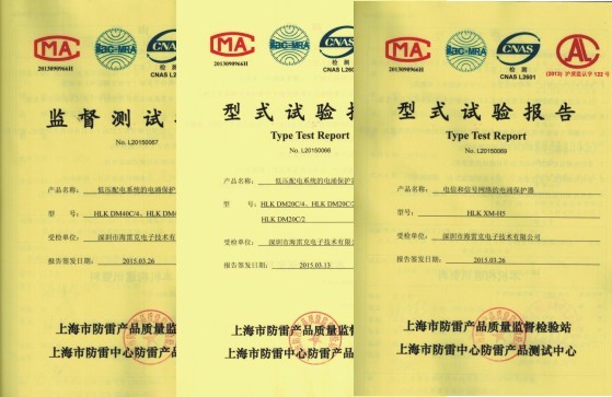 2015年2-3月,公司多个型号的防雷器产品送上海市防雷中心防雷产品测试中心做型式试验,所有产品均一次性通过全部试验,并且获得试验合格报告证书。本次试验的产品型号如下: