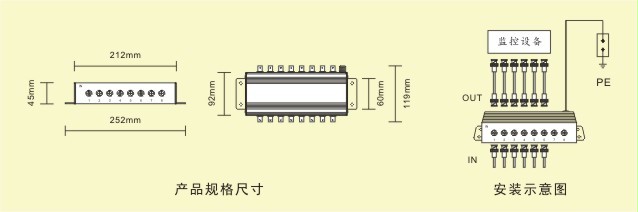 ◆ 8个HLK X/BNC-VIDEO电涌保护器的合成产品,安装在闭路监控设备的同轴视频信号端口,用于信号线路防雷及抗浪涌保护,同时满足8路视频信号线路防雷保护及电气特性要求;